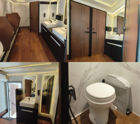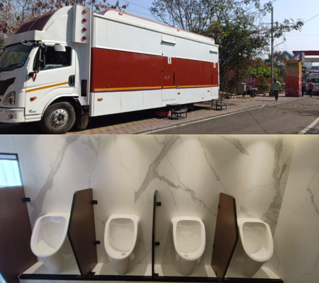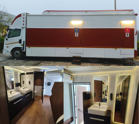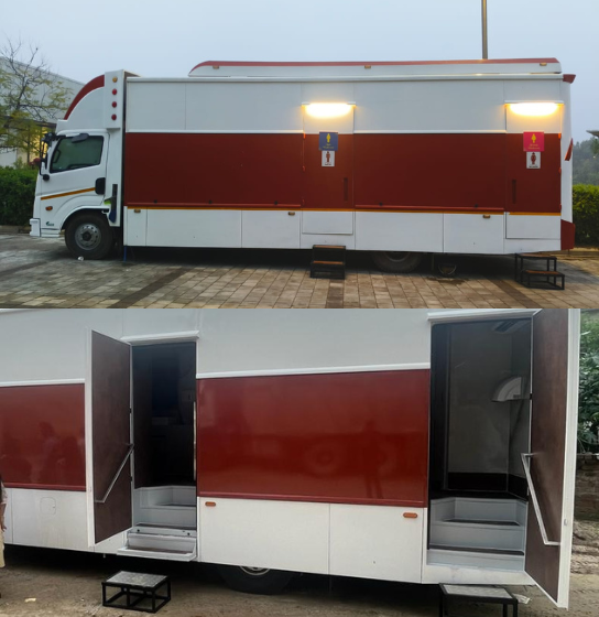 Our luxury toilet bus offers a clean, spacious, air-conditioned restroom experience with high-end interiors, music system, LED lighting, and automated amenities.